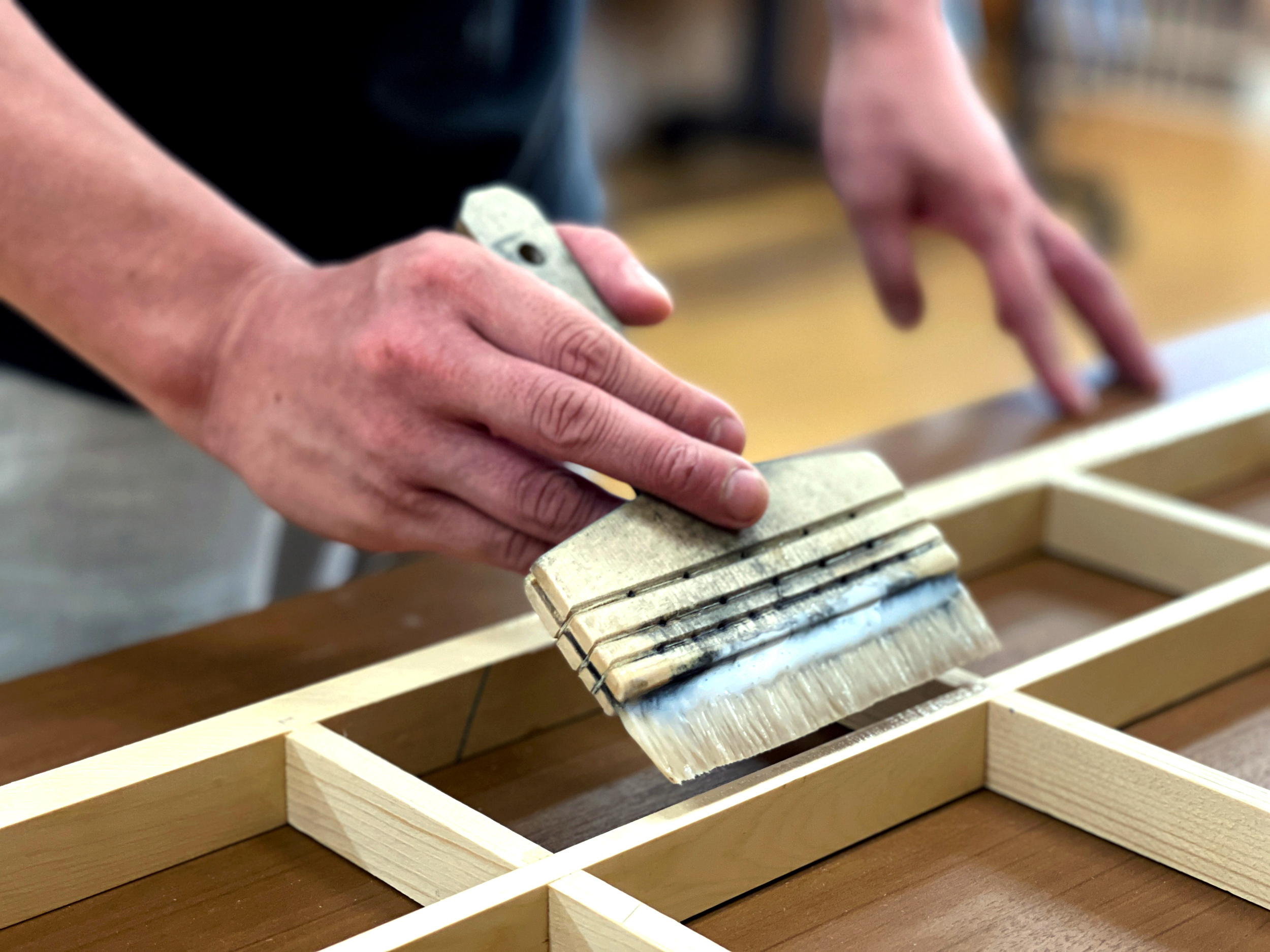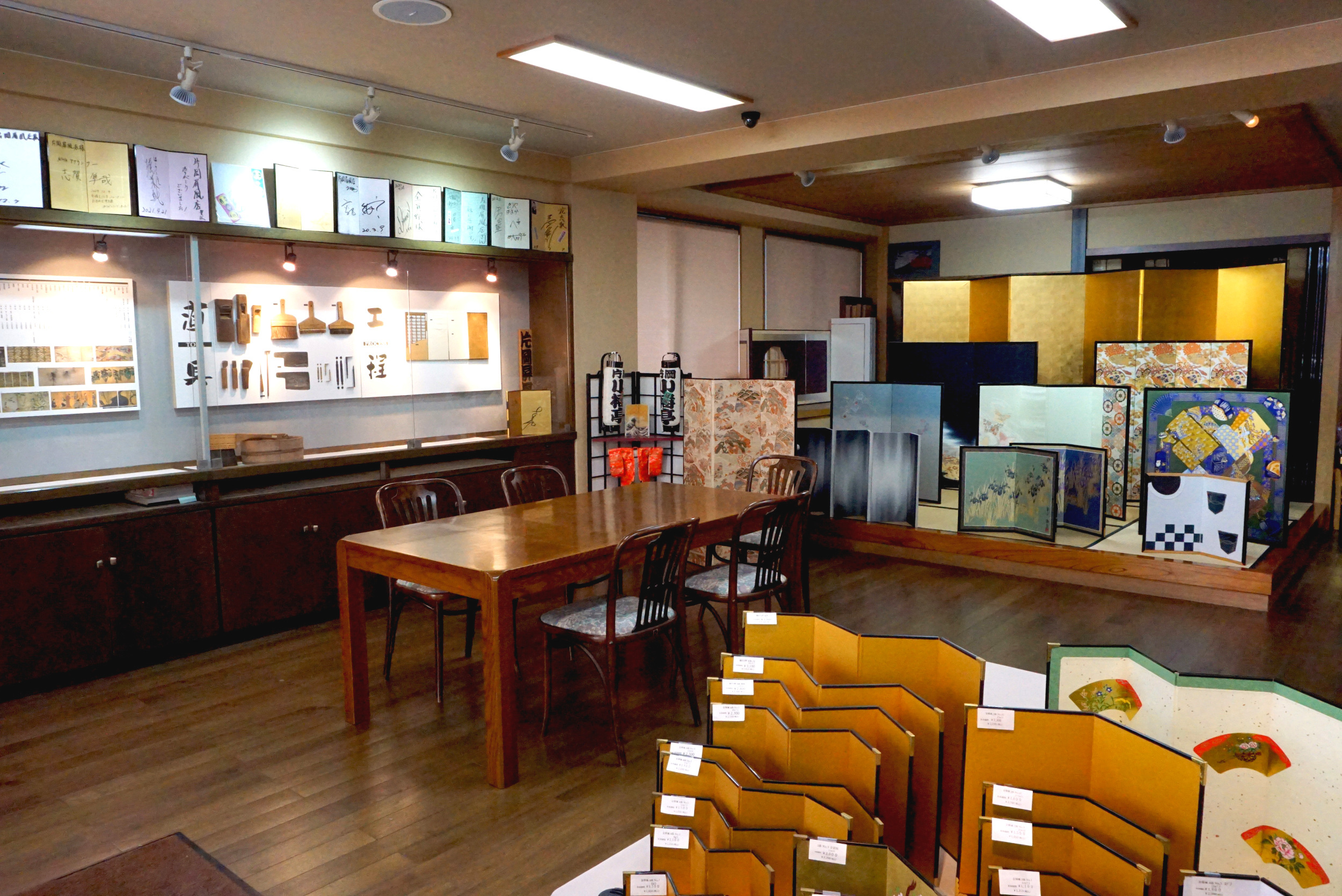The showroom serves as a display space featuring numerous examples of our previous work, as well as the folding screens we have crafted. Visitors are welcome to view the displays and we offer consultations for custom orders while they do so.